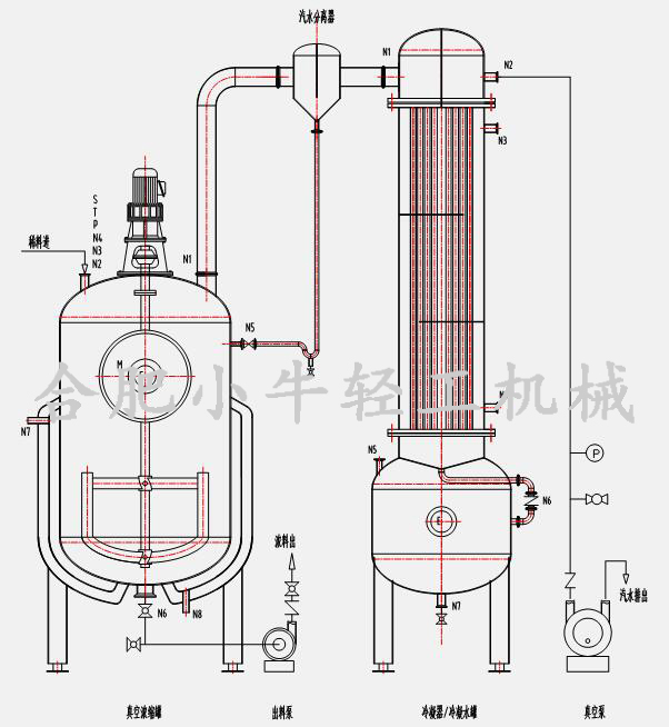合肥小牛真空減壓濃縮器加熱形式可根據(jù)用戶工況設(shè)計(jì)為蒸汽加熱式或電加熱式,滿足無鍋爐熱源的用戶使用。真空濃縮罐設(shè)有夾套及保溫層,夾套內(nèi)通入蒸汽(蒸汽加熱式)或?qū)嵊停娂訜崾剑┻M(jìn)行加熱,從而給濃縮罐內(nèi)物料間接傳熱,耐高溫保溫層能有效隔熱保溫,減少能耗,有效避免操作人員燙傷事故發(fā)生。罐體配有視鏡視燈,能夠隨時(shí)觀察罐內(nèi)狀態(tài)。生產(chǎn)完成后,利用CIP自動(dòng)旋轉(zhuǎn)清洗球能夠?qū)迌?nèi)進(jìn)行360度沖洗。特殊定制的攪拌裝置有效地避免了料液因濃度過高而出現(xiàn)的粘壁現(xiàn)象,攪拌裝置采用優(yōu)質(zhì)機(jī)械密封,確保不會(huì)因高真空而出現(xiàn)漏氣現(xiàn)象。真空濃縮罐內(nèi)物料受熱而產(chǎn)生的蒸汽中帶有有效成份的泡沫在汽液分離器中被分離出來通過管道回流至罐內(nèi),其余二次蒸汽通過列管式換熱器被冷凝成液體,進(jìn)入冷凝水收集罐,最后排出或回收利用,不凝性氣體隨真空泵一起排出。該設(shè)備可進(jìn)行負(fù)壓或常壓操作,也可以進(jìn)行連續(xù)或間歇生產(chǎn)。